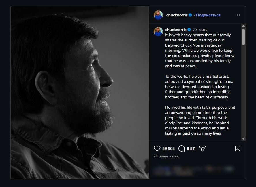 С тяжестью в сердце наша семья сообщает о внезапной кончине нашего любимого Чака Норриса вчера [в четверг] утром. Мы бы хотели сохранить в тайне обстоятельства его смерти, но, пожалуйста, знайте, что он был окружен своей семьей и ушел из жизни спокойно. Для всего мира он был мастером боевых искусств, актером и символом силы. Для нас он был преданным мужем, любящим отцом и дедушкой, невероятным братом и душой нашей семьи. Он прожил свою жизнь с верой, целеустремленностью и непоколебимой преданностью людям, которых любил. Своей работой, дисциплинированностью и добротой он вдохновил миллионы людей по всему миру и оказал огромное влияние на их жизнь. Несмотря на то, что наши сердца разбиты, мы глубоко благодарны за ту жизнь, которую он прожил, и за те незабываемые моменты, которые нам посчастливилось разделить с ним. Любовь и поддержка, которые он получал от поклонников по всему миру, очень много значили для него, и наша семья искренне благодарна за это. Для него вы были не просто фанатами, вы были его друзьями. Мы знаем, что многие из вас слышали о его недавней госпитализации, и мы искренне благодарны вам за молитвы и поддержку. Мы скорбим об этой утрате и просим уважать право нашей семьи на приватность в это время. Спасибо, что любили его вместе с нами. С любовью, семья Норрис.