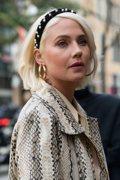 Ободок снова в центре внимания, но в более сдержанном и продуманном виде. В тренде плотные, фактурные модели (бархат, кожа, текстиль). Цвета варьируются от спокойных темных до свежих весенних оттенков. Волосы при этом не должны быть плотно приглажены: важен легкий объем у корней и ощущение воздуха. Ободок располагается не у самой линии роста волос, а чуть дальше, чтобы избежать заломов и сохранить естественность. Длину можно оставить распущенной или собрать в хвост или косу.