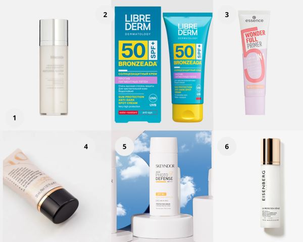 1. Увлажняющий крем-хайлайтер с SPF 15, Lifecode. 2. Крем солнцезащитный против пигментных пятен Bronzeada, Librederm 3. Праймер Wonder Full Primer 5 In 1, essence. 4. Праймер Ten! sational 10 in 1 Dream Primer, Catrice. 5. Солнцезащитный крем Age Photo Defense SPF 50, Skeyndor. 6. Идеальная защита SPF 30, Eisenberg.