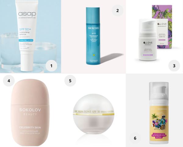 1. Увлажняющий солнцезащитный крем 3 в 1 SPF 50+, asap. 2. Крем с SPF 50, SMORODINA. 3. Защитный иммуномоделирующий крем SUNNY FIG SPF 50 & PA++++, G.Love. 4. BBB-крем для лица увлажняющий тональный с SPF 25 Celebrity Skin, SOKOLOV BEAUTY. 5. Крем дневной увлажняющий SPF 30, White Gold, OROGOLD. 6. Солнцезащитный флюид для лица SPF50+ Союзмультфильм, moisturizing, Geltek.