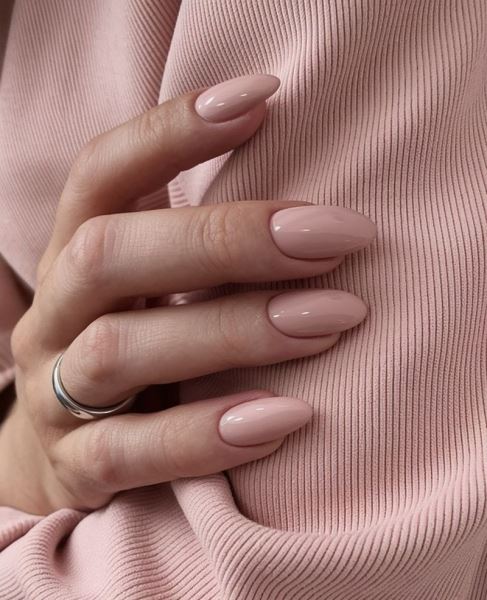Ледяной беж с едва заметной серым подтоном создает эффект прозрачной ногтевой пластины. На холодной коже лак почти сливается с тоном руки, удлиняя ноготь, а на теплой — сохраняет чистую линию, не перегружая форму.
