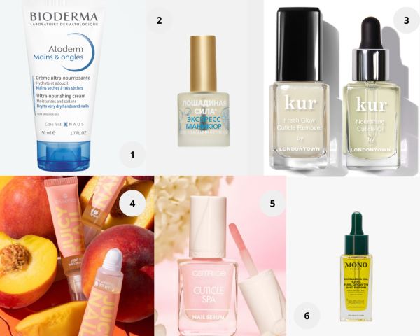 1. Крем для рук и ногтей Atoderm, Bioderma. 2. Корректор для удаления кутикулы с гиалуроновой кислотой, «Лошадиная Сила». 3. Набор для ухода за кутикулой «Увлажнение и Восстановление», LONDONTOWN. 4. Масло для ногтей JUICY NAIL nail oil с персиковым ароматом, essence. 5. Ухаживающая сыворотка для кутикулы и ногтей Cuticle Spa Nail Serum, Catrice. 6. Масло монарды для ногтей, Mono Beauty.