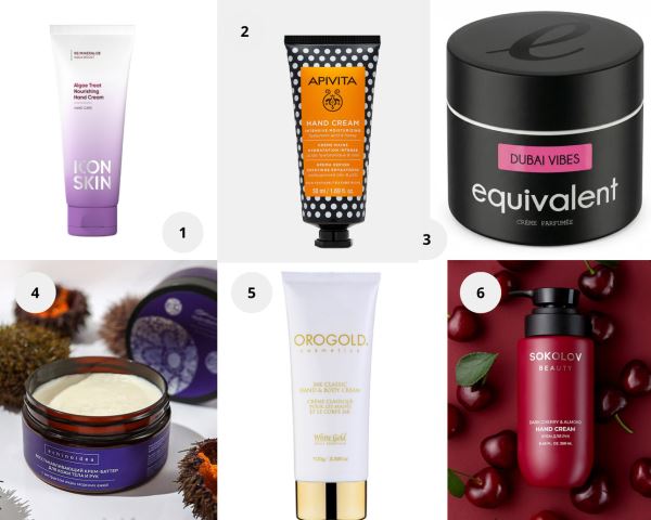 1. Питательный крем для рук Algae Treat, Icon Skin. 2. Интенсивный увлажняющий крем для рук с гиалуроновой кислотой и медом, Apivita. 3. Парфюмированный крем-баттер для рук и тела «Дубайский вайб», Equivalent. 4. Восстанавливающий крем-баттер для кожи тела и рук с экстрактом икры морских ежей, Hydrobionique. 5. Классический крем для рук и тела, OROGOLD. 6. Крем для рук DARK CHERRY & ALMOND, SOKOLOV BEAUTY.
