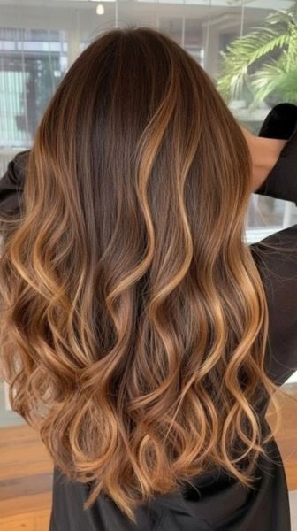 Еще один тренд, который особенно хорошо подходит брюнеткам, — карамельные блики. После зимы, когда темные волосы выглядят особенно контрастно на фоне холодной погоды, многие хотят добавить цвету немного тепла. Карамельный флан решает эту задачу максимально естественно. В темную базу добавляются теплые карамельные оттенки, которые создают эффект слегка выгоревших на солнце волос. Окрашивание делает цвет более многогранным. На солнце пряди красиво переливаются, а сама прическа выглядит более объемной.