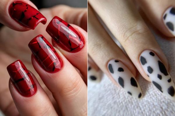 Отдельный тренд, который пошел с подиумов в народ — принт далматинца. Это идеальная замена классическому горошку для тех, кто хочет чего-то свежего. Белая база и хаотичные черные пятна разного размера выглядят игриво, но стильно. Особенно, если добавить на один ноготь красный акцент.