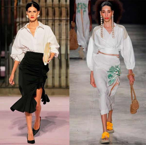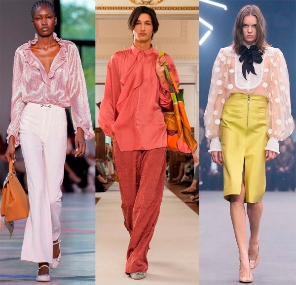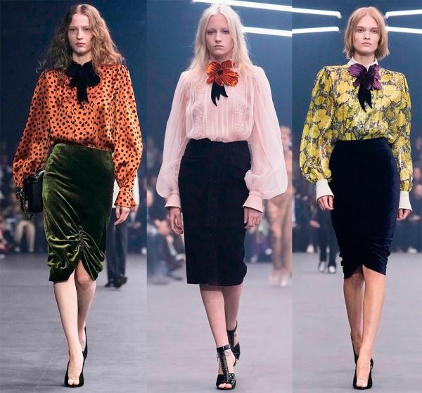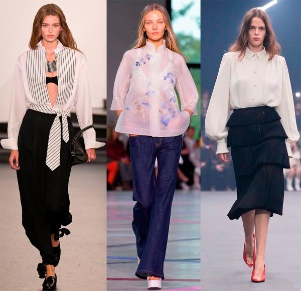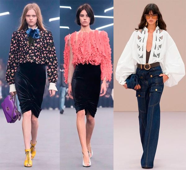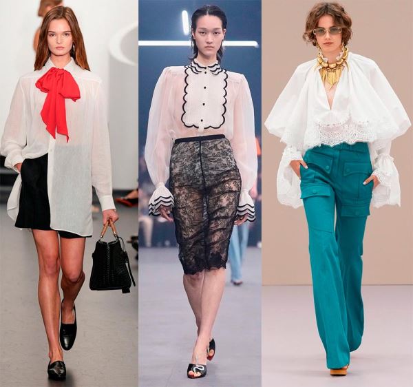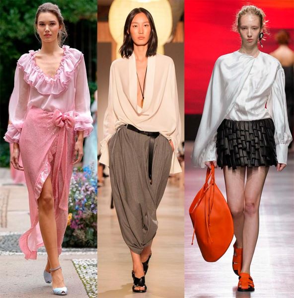 Силуэт может быть свободный, с драпировками, объемными рукавами, с акцентной линией плеч. Разного кроя могут быть и воротники блуз, в этом сезоне популярны маленькие отложные воротники, стойка, воротники-воланы, шалевые, хомут, лодочка, а также воротник аскот. Воротник аскот – это воротник, переходящий в длинные ленты, которые можно завязать на шее галстуком, бантом или просто узлом.
