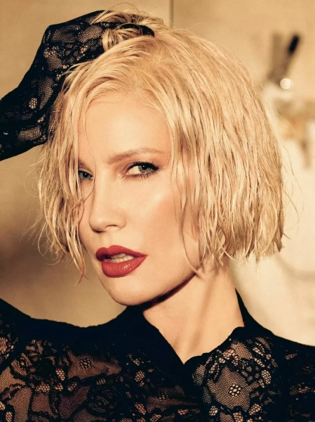 Для свежей фотосессии Летучая нарядилась в образ женщины вамп, примерив закрытый полупрозрачный кружевной комбинезон, подчеркивающий фигуру, а новую стрижку уложила с помощью геля, создав эффект мокрых волос. Кстати, недавно похожую прическу показывала звезда “Чудо-женщины”, американо-израильская актриса Галь Гадот. Завершала наряд ведущей бессмертная классика макияжа, алая помада.