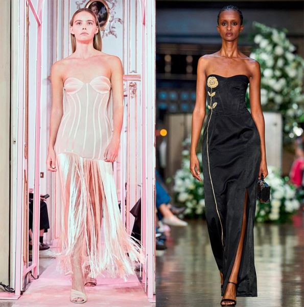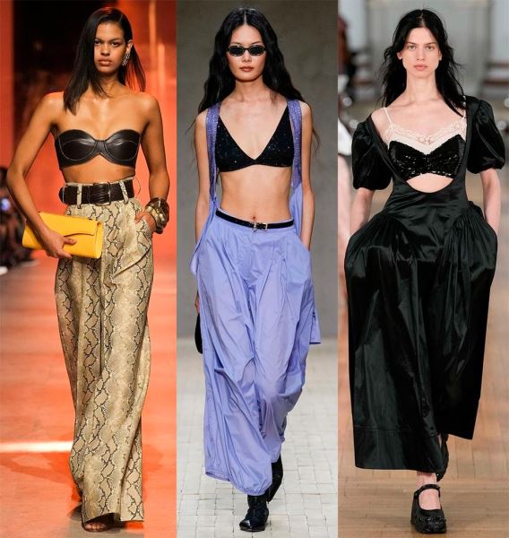 Помимо использования бюстгальтера как самостоятельного топа, есть еще варианты, в которых дизайнеры также делают акцент на тот же бюстгальтер. Это глубокий вырез, позволяющий продемонстрировать свое нижнее белье, но и здесь следует задуматься, ведь на подиуме можно все позволить, а на улицах города…