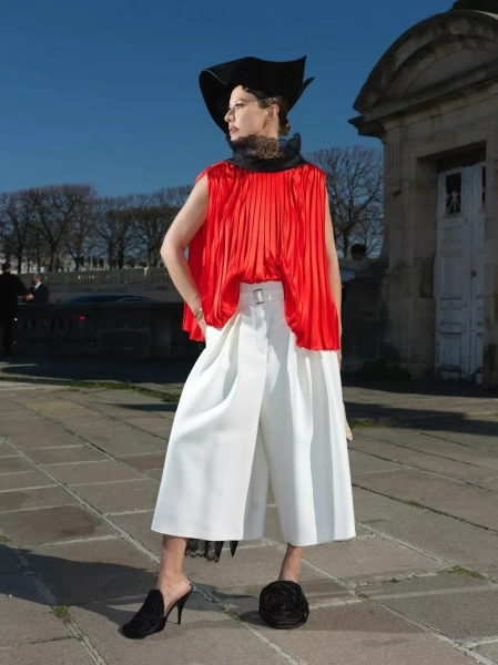 Мы уже рассказали о том, как встретились на шоу Dior Рената Пиотровски и Анна Александрова, а теперь покажем эффектный образ Ксении Собчак с того же показа. Подопечная стилистов Миши и Китти примерила аутфит из новой коллекции бренда: белые кюлоты с высокой посадкой и плиссированную алую блузку без рукавов с черным кружевным жабо, а также авангардную “треуголку” и мюли на каблуке с объемными мысами в форме черных роз. Образ дополняла миниатюрная разноцветная сумка-седло от Dior.