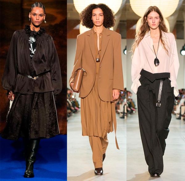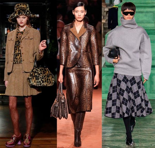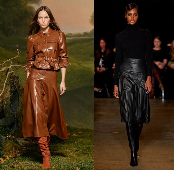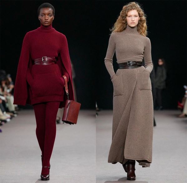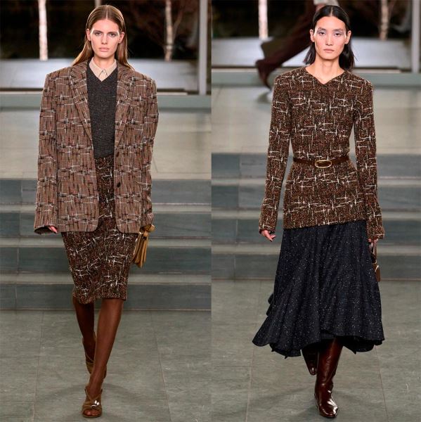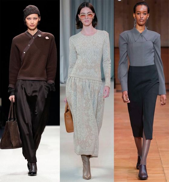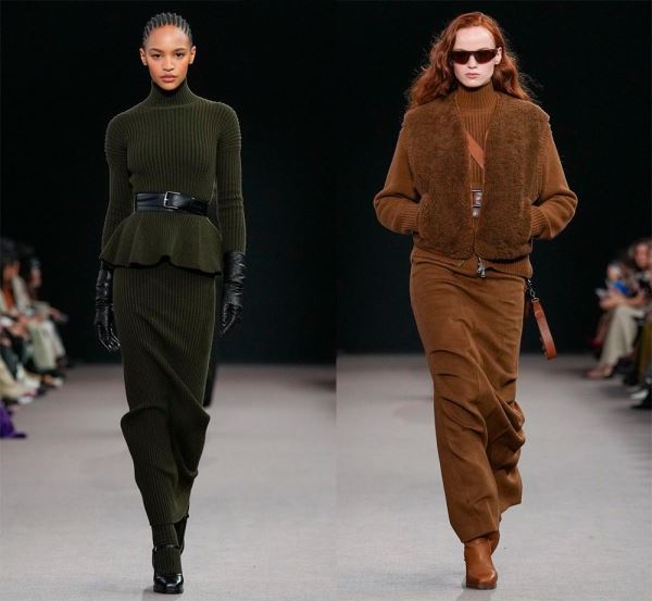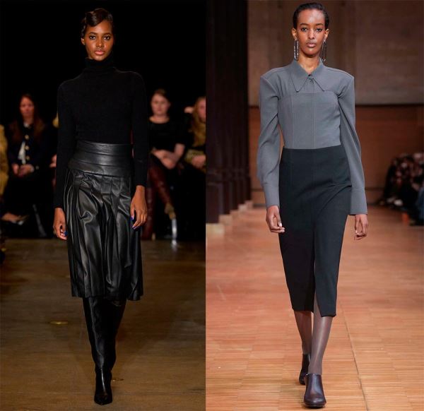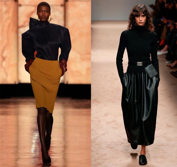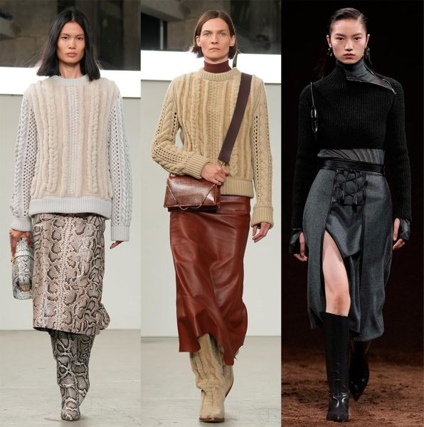 По-деловому, но с изюминкой, смотрятся зимние офисные наряды Hermès, просто и стильно – у Gabriela Hearst, где теплый свитер с рельефными, крупными узорами добавляет образу тепло и комфорт, а кожаные юбки – элегантность и уверенность.