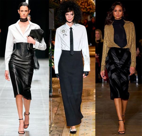 Это всегда нарядно, дорого, и по-деловому. Кожаную юбку-карандаш или брюки можно надевать с различным верхом, например, со свитером, футболкой, водолазкой, рубашкой, романтической блузкой, с пиджаками и жакетами. В качестве обуви тоже все просто, в образ вписываются туфли, сапоги, ботильоны и даже кеды. А вообще-то, любая кожаная одежда с элементами классики добавит в образ уверенности, элегантности и может быть использована для различных стилей.
