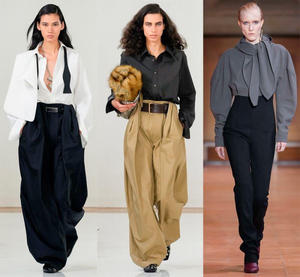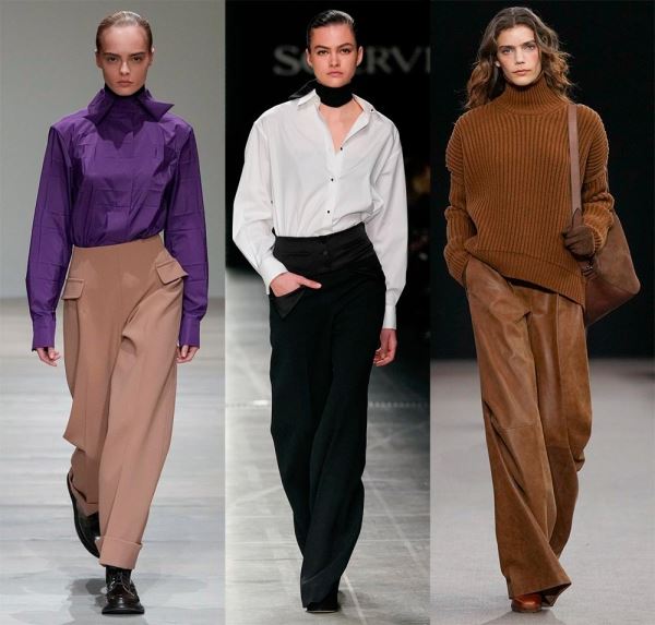 Брюки великолепно дополнят офисный гардероб. Брюки с широкими штанинами не всегда приветствовались в деловых костюмах. Но сейчас дизайнеры предлагают модницам выбрать необычные широкие штаны. Хотелось бы заметить, что данный образ украшает не многих девушек, а мода и красота – это не одно и то же. Поэтому выбор за вами.