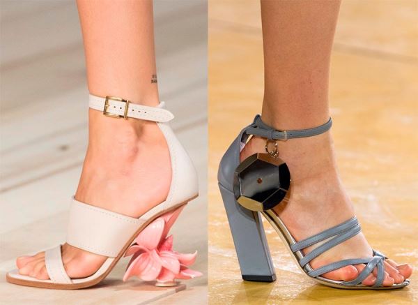 Обратите внимание на босоножки с каблуком в форме геометрических фигур, абстрактных форм. В моде сложные архитектурные, деформированные и скошенные каблуки.