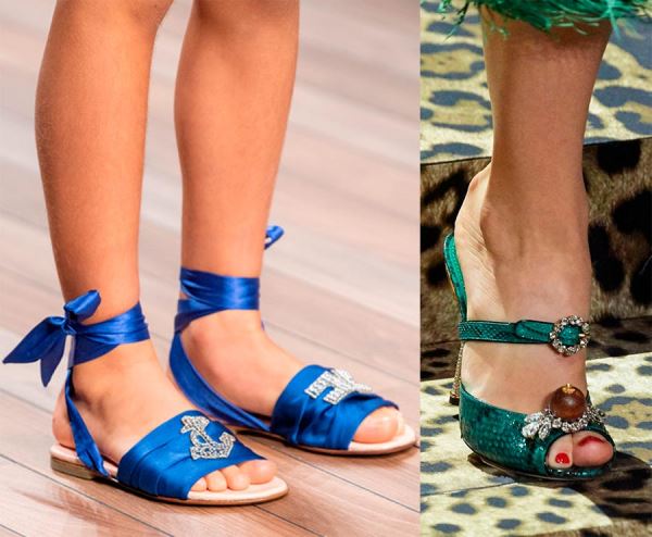 Летом 2020 в моде будет обувь различных цветов и фактур. Во многих коллекциях особенно выделились цветные, золотистые и серебристые металлизированные фактуры. Золотистые или серебристые босоножки очень универсальны. Они легко вписываются в гардероб, сочетаются с любыми цветами и служат как повседневным, так и нарядным аксессуаром.