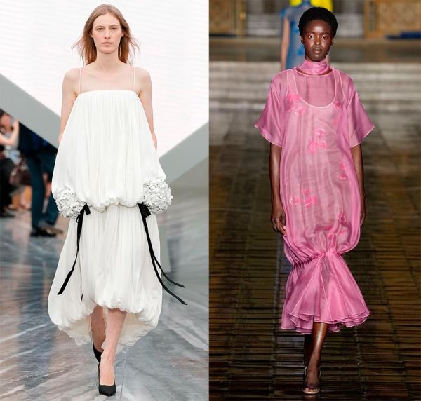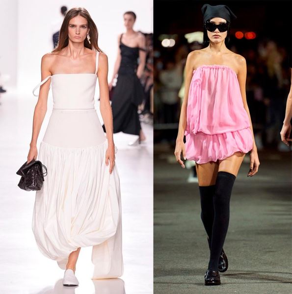 Интересные интерпретации фасона показал бренд Coperni, где рукава также выполнены в подобном крое и сливаются с платьем, образуя форму кокона. Или бренд Louis Vuitton, в коллекции которого платье-баллон приобретает новые и смелые вариации силуэта.