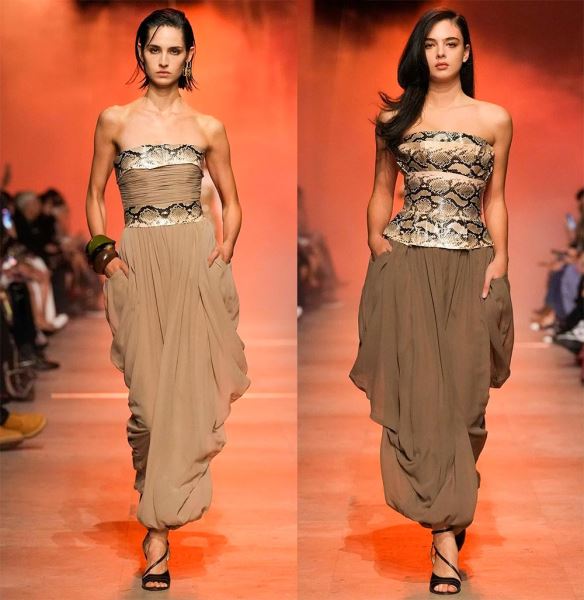 В современной моде большое разнообразие моделей, и шьются они из натуральных и мягких тканей, таких как шелк, атлас, ситец, трикотаж. Цветовая гамма неограниченна, выбирайте на свой вкус, учитывая обстановку, в которой вам предстоит находиться, для более официальной выбирайте однотонные, приглушенных оттенков, для повседневного варианта подойдут разнообразные цвета, можно яркие и с принтом. Лучше, если ткани будут легкие и динамичные, однако некоторые дизайнеры успешно используют и более плотные материалы, такие как деним или кожа, например, в коллекции Brandon Maxwell, Giuseppe Di Morabito…