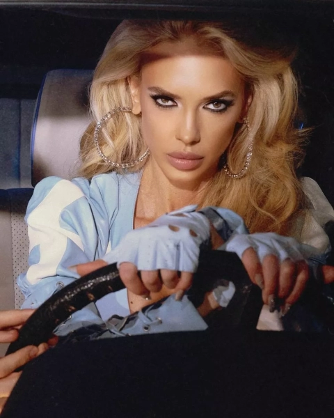 Сысоева выбрала кожаный мотоциклетный комплект из куртки и брюк в бело-голубом оттенке, который носила поверх откровенного небесно-голубого бра. Актриса уложила волосы пышными объемными волнами и дополнила концептуальный наряд серебристым ремнем, крупными блестящими серьгами-кольцами и голубыми кожаными перчатками без пальцев.
