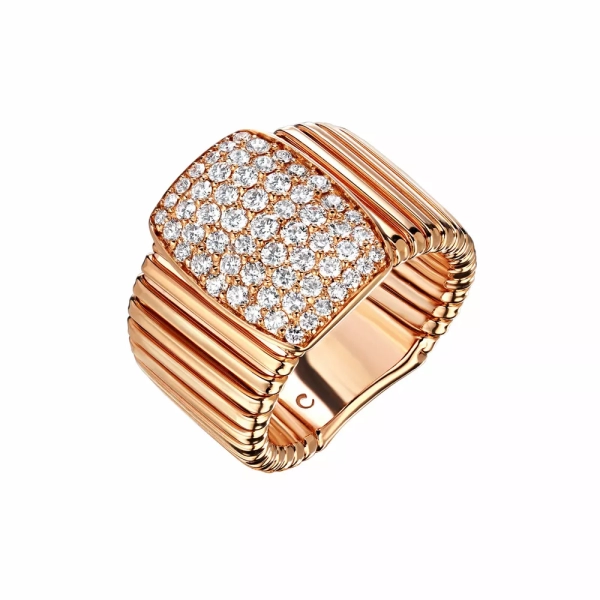 Флагманская коллекция FETTUCCINE предстала в обновленном дизайне. Жесткие браслеты, многослойные кольца и серьги из красного золота созданы в соавторстве с итальянскими мастерами. В новом сезоне капсула получила более сложную световую архитектуру за счет сочетания классической круглой огранки бриллиантов с фантазийными формами багета, маркиза и груши в одном изделии.