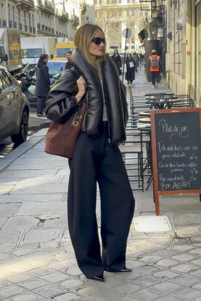 Рози была одета в эффектный авангардный короткий пуховик из кожи кофейного оттенка от бренда Alaïa, белую базовую футболку, свободные черные брюки на кожаном ремне и остроносые лакированные ботильоны. Ее аутфит дополняли коричневая замшевая сумка-тоут на черных кожаных ручках и стильные солнцезащитные очки. Манекенщица распустила волосы и нанесла максимально естественный макияж.